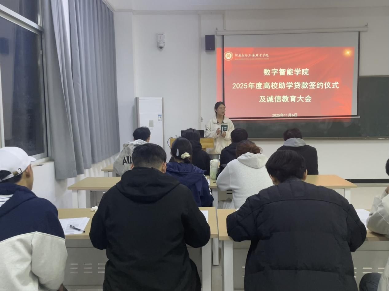 2025年11月6日,数字智能学院举行高校助学贷款签约仪式及诚信教育大会,旨在落实国家资助政策,强化学生诚信意识,助力家庭经济困难学生顺利完成学业。数字智能学院全体高校助学贷款申请学生参与会议,现场气氛庄重而热烈。