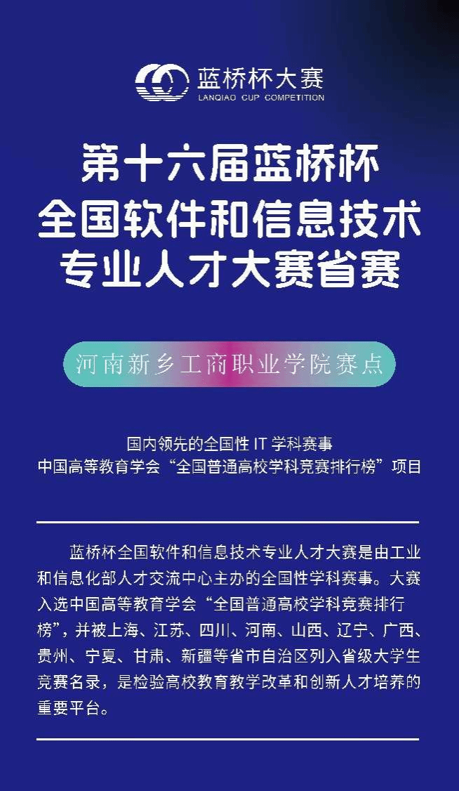 4月12日,数字智能学院承办的第十六届“蓝桥杯”全国软件和信息技术专业人才大赛个人赛(软件赛)省赛成功举办。本次比赛在教学楼共设立2个机房考场,比赛以机试形式进行,全程4小时。我校数字智能学院、河南女子职业学院共计56名选手参与竞赛。