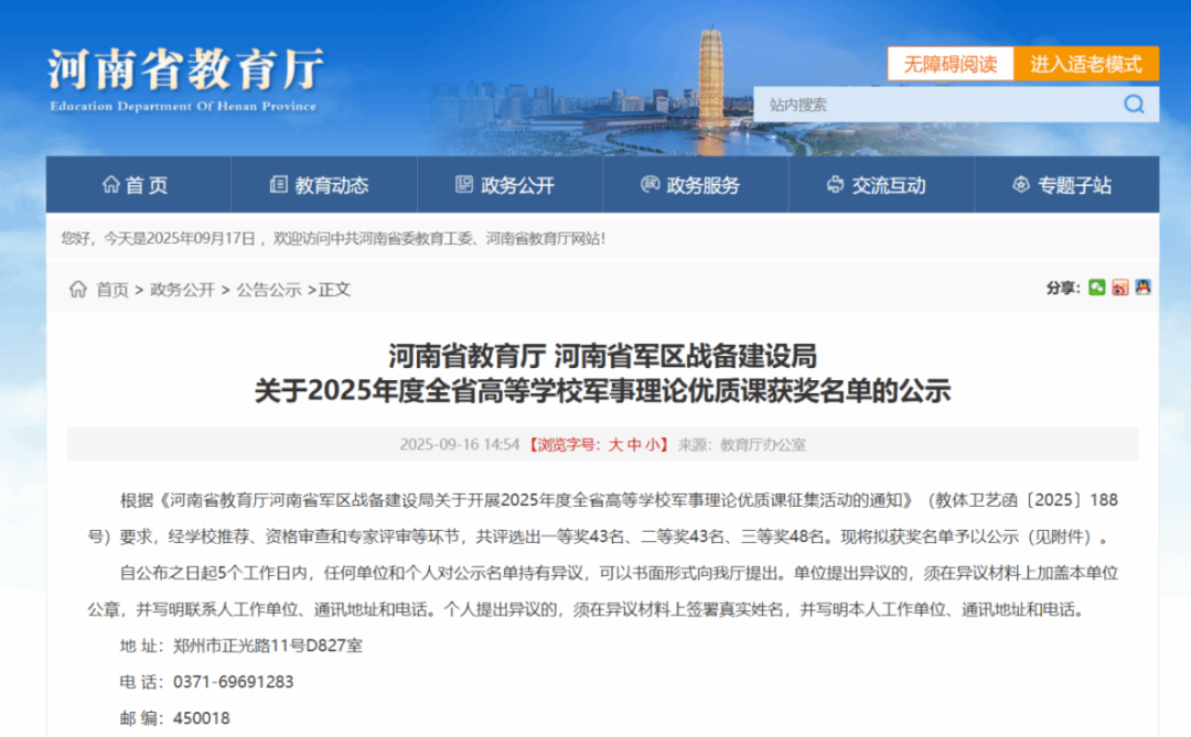 近日,河南省教育厅公布2025年度全省高等学校军事理论优质课获奖名单,我校选送袁进展老师的《信息化装备和信息化作战平台(一)》、李晓梅老师的《国防法的“新”与“心”》两个课程凭借鲜明的时代特色、创新的教学模式和深刻的育人价值,双双荣获省级二等奖。
