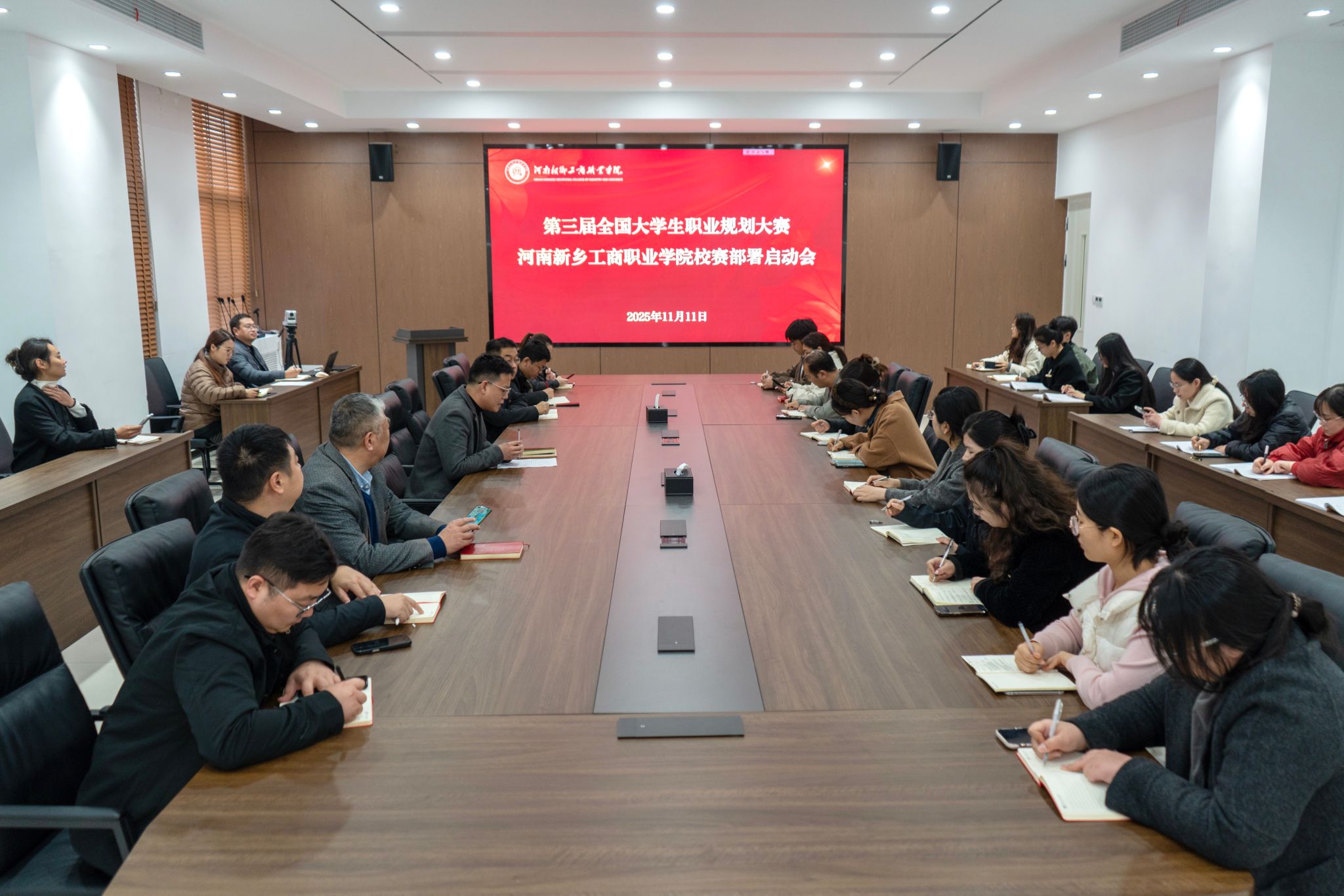 为深入贯彻落实党中央、国务院关于高校毕业生就业工作的决策部署,强化生涯教育与就业指导,提升学生职业规划能力与就业竞争力,11月11日,我校于教学楼7A212会议室隆重召开第三届全国大学生职业规划大赛河南新乡工商职业学院校赛部署启动会。执行校长吴勇军出席会议并讲话。各二级学院领导、学生处处长、职业发展与就业指导课程教师、全体辅导员及产业发展中心(就业处)人员参会。会议由产业发展中心(就业处)处长姚培主持。