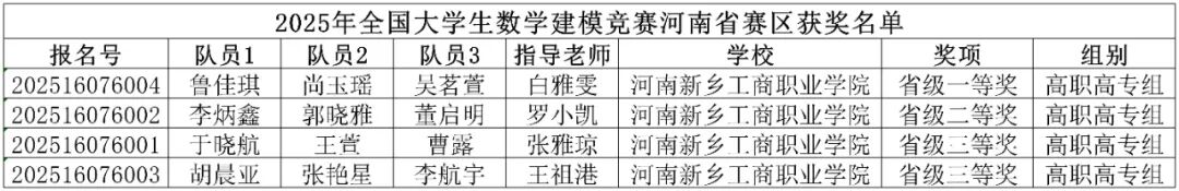 近日,2025年“高教社杯”全国大学生数学建模竞赛成绩正式揭晓。我校学子首创佳绩,由我校通识教育中心高数教师王祖港、张雅琼指导的四支队伍,分别荣获河南省一等奖1项、二等奖1项、三等奖2项的荣誉。