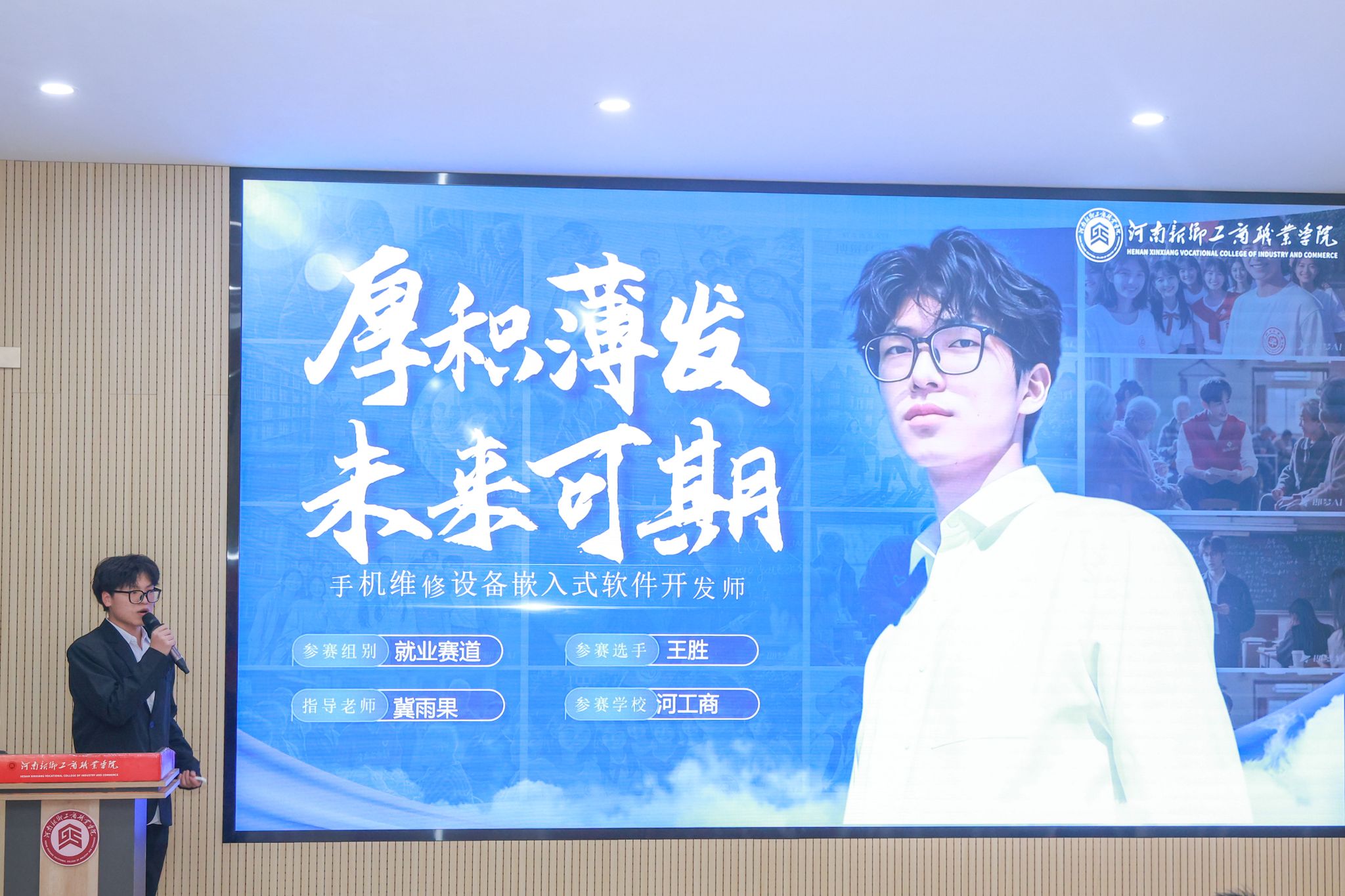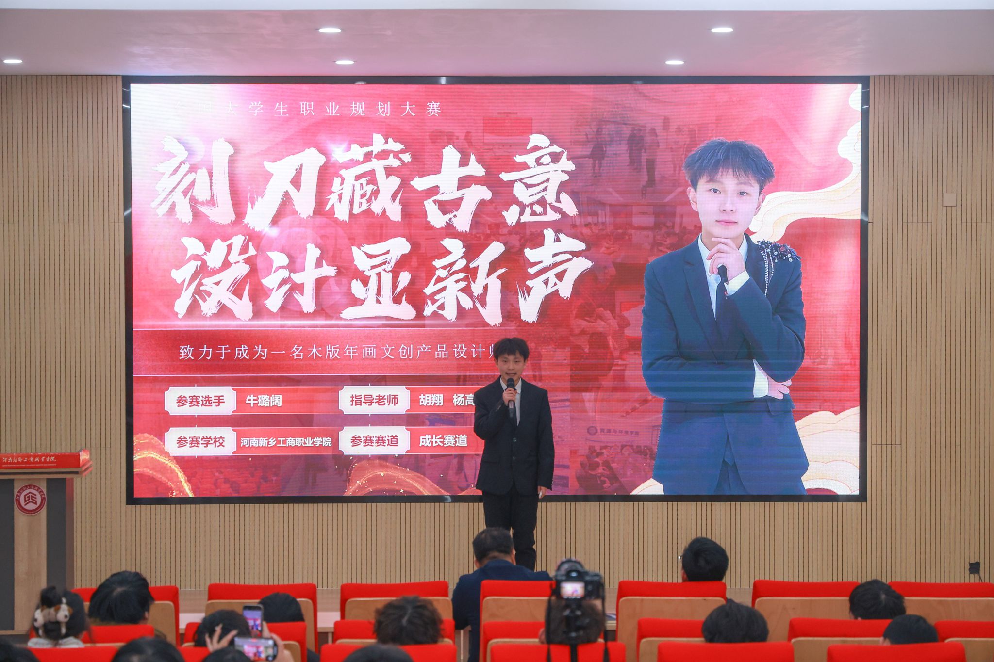 活动中,三位学生代表依次登台,围绕自身参赛赛道展开职业规划阐述。