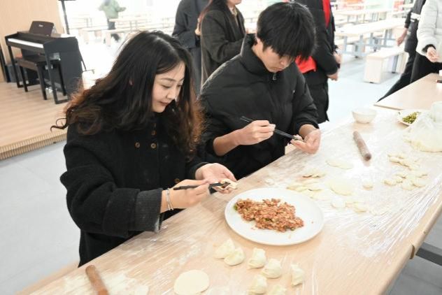 有人熟练擀皮,有人巧手捏褶,有人创意包出 “元宝饺”“月牙饺”,书记、主任与老师们也加入队伍,和同学们围站在面案旁,手把手教学、笑谈生活趣事。面案上的馅料渐渐化作一排排形态各异的饺子,腾腾热气裹着香气漫满整个餐厅。