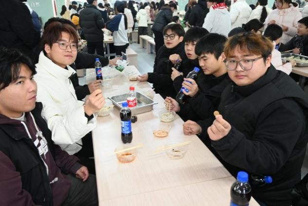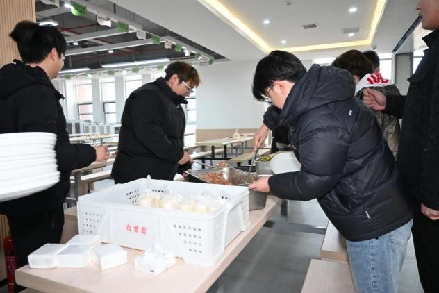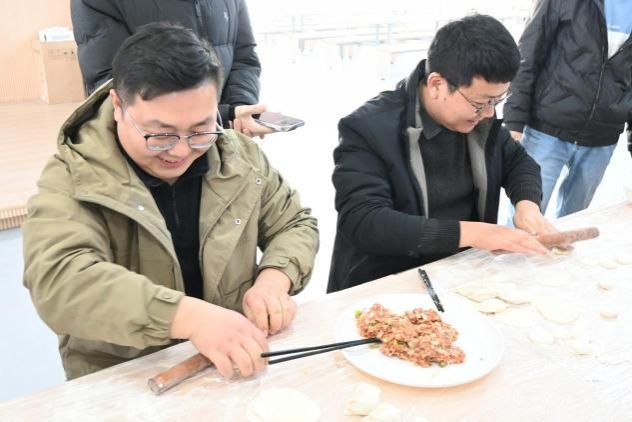现场还设置了包饺子趣味比赛,各组师生默契配合,擀皮的速度与包馅的精巧程度 “齐头并进”,时不时传出 “这个饺子褶捏得真好看”“咱们组速度要追上啦” 的打趣声,连空气中都浸着热闹与亲昵。待饺子下锅、热气升腾,大家端着盛满饺子的餐盒围坐分享,席间还藏着惊喜,有幸运的师生咬到了包入硬币的饺子。后厨还贴心准备了热乎的紫菜蛋花汤,一口饺子一口汤,暖身又暖心。