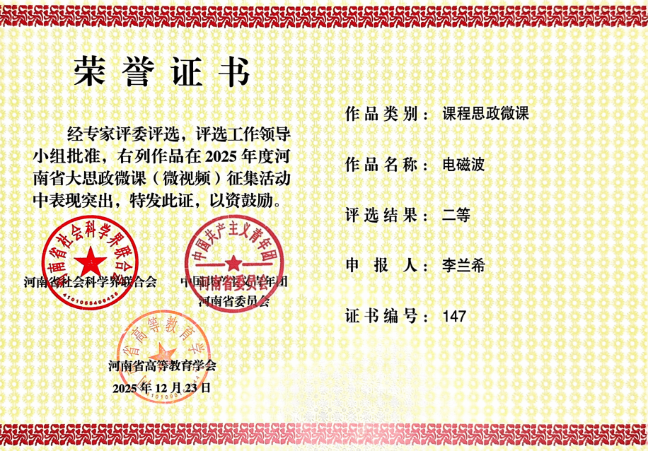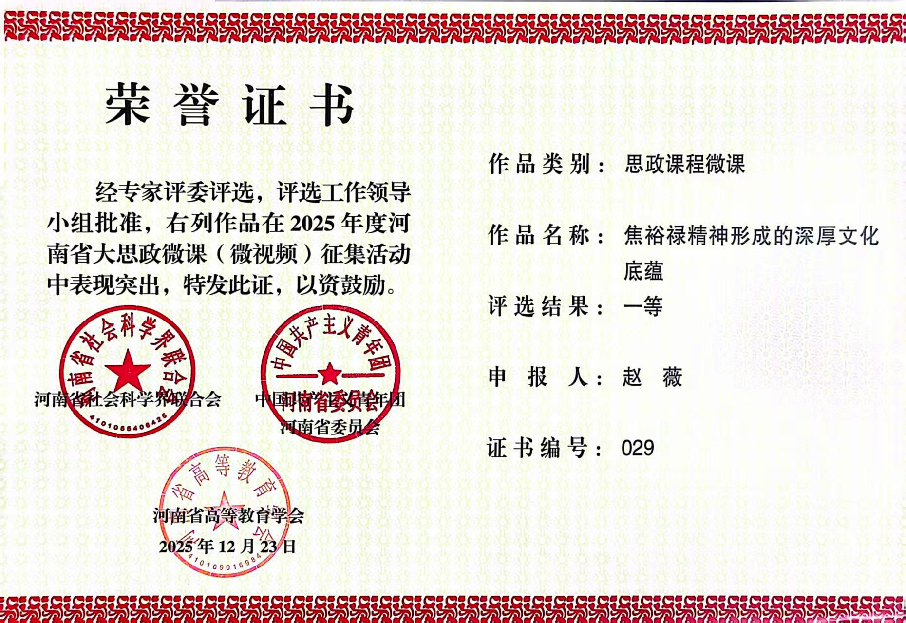 长期以来,我校持续提升思政引领力,坚持不懈用习近平新时代中国特色社会主义思想铸魂育人,不断完善‘大思政课’育人新格局,着力培养让党放心、爱国奉献、担当民族复兴重任的时代新人,思政课程建设成效显著。同时学校全面推进课程思政建设,深入挖掘具有职业特征与行业特色的思政元素,推动思政课程与课程思政协同发力、同向同行,着力构建协同育人新格局,将立德树人根本任务贯穿教育教学全过程,持续促进思政教育与专业教育深度融合。近日,由河南省社科联、共青团河南省委、河南省高等教育学会联合举办的2025年度河南省大思政微课征集活动评选结果正式揭晓,我校教师在此次评选中斩获佳绩,充分彰显了学校大思政建设的扎实成效与协同育人的丰硕成果。