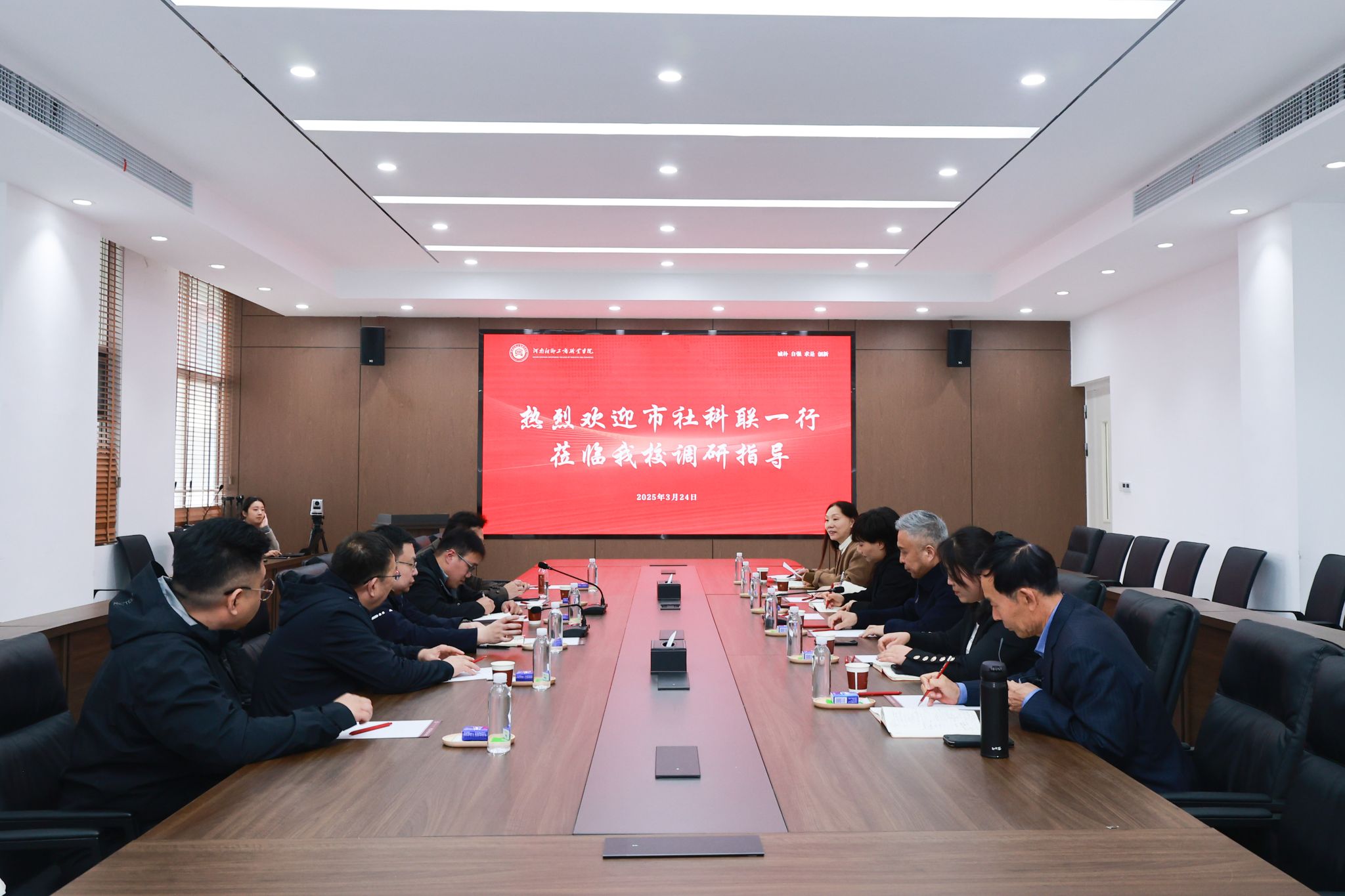 3月24日下午,新乡市社科联党组书记、主席王力,秘书长杜明超一行莅临我校调研指导。“中国好人”、国家一级导演王文洋、新乡传统文化协会会长李建中随同调研。我校党委书记刘建学,副校长刘文娟出席座谈,党委宣传部、马克思主义学院、教务处、学生处等相关部门负责人参加座谈。