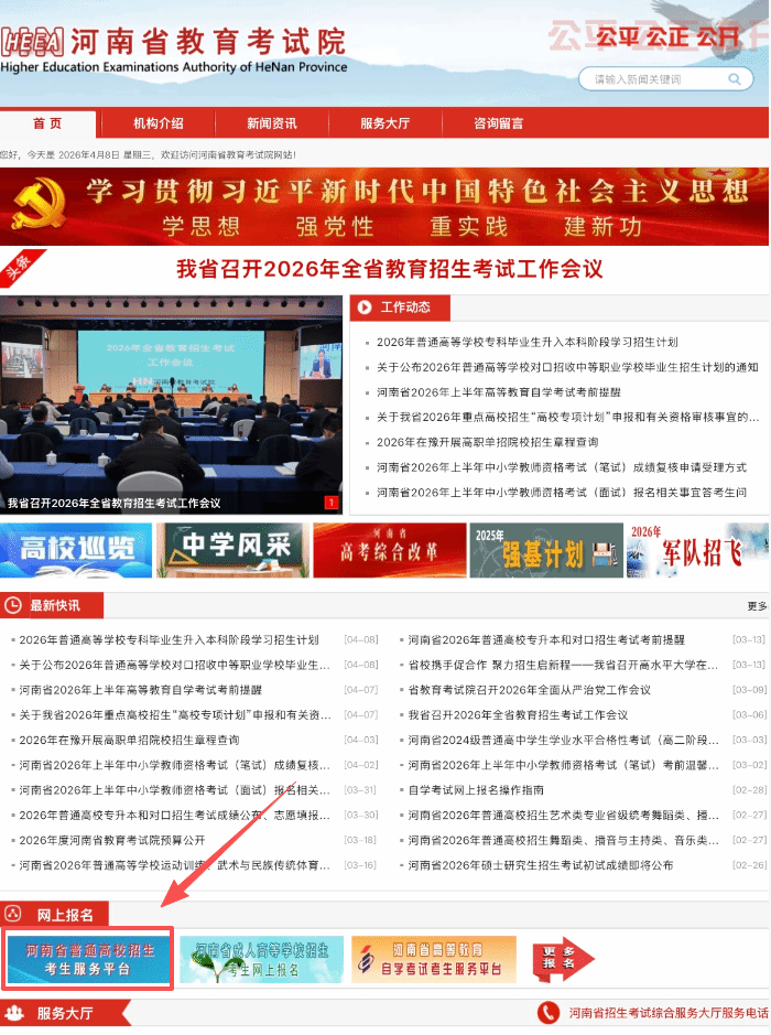 点击跳转进入河南省教育考试院官网,点击如下图示位置,进入“河南省普通高校招生考生服务平台”(https://pzwb.haeea.cn)系统。