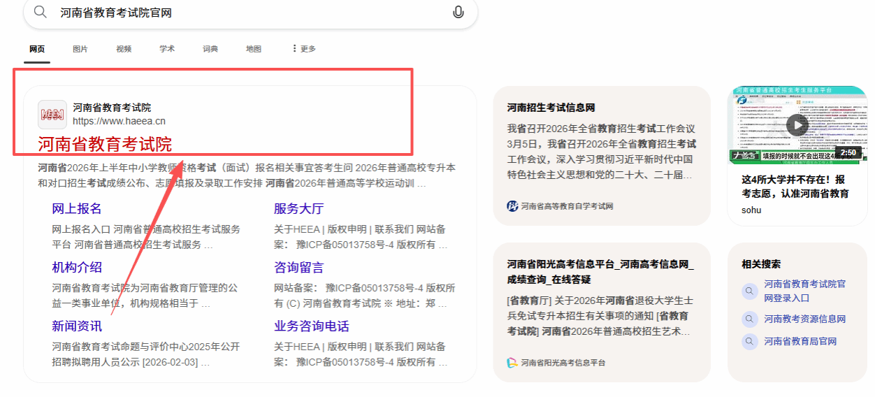 考生登录河南省教育考试院官网(https://www.haeea.cn/),或在搜索引擎中输入“河南省教育考试院”,点击带有“官方”标识的网站。