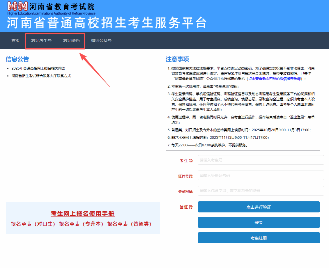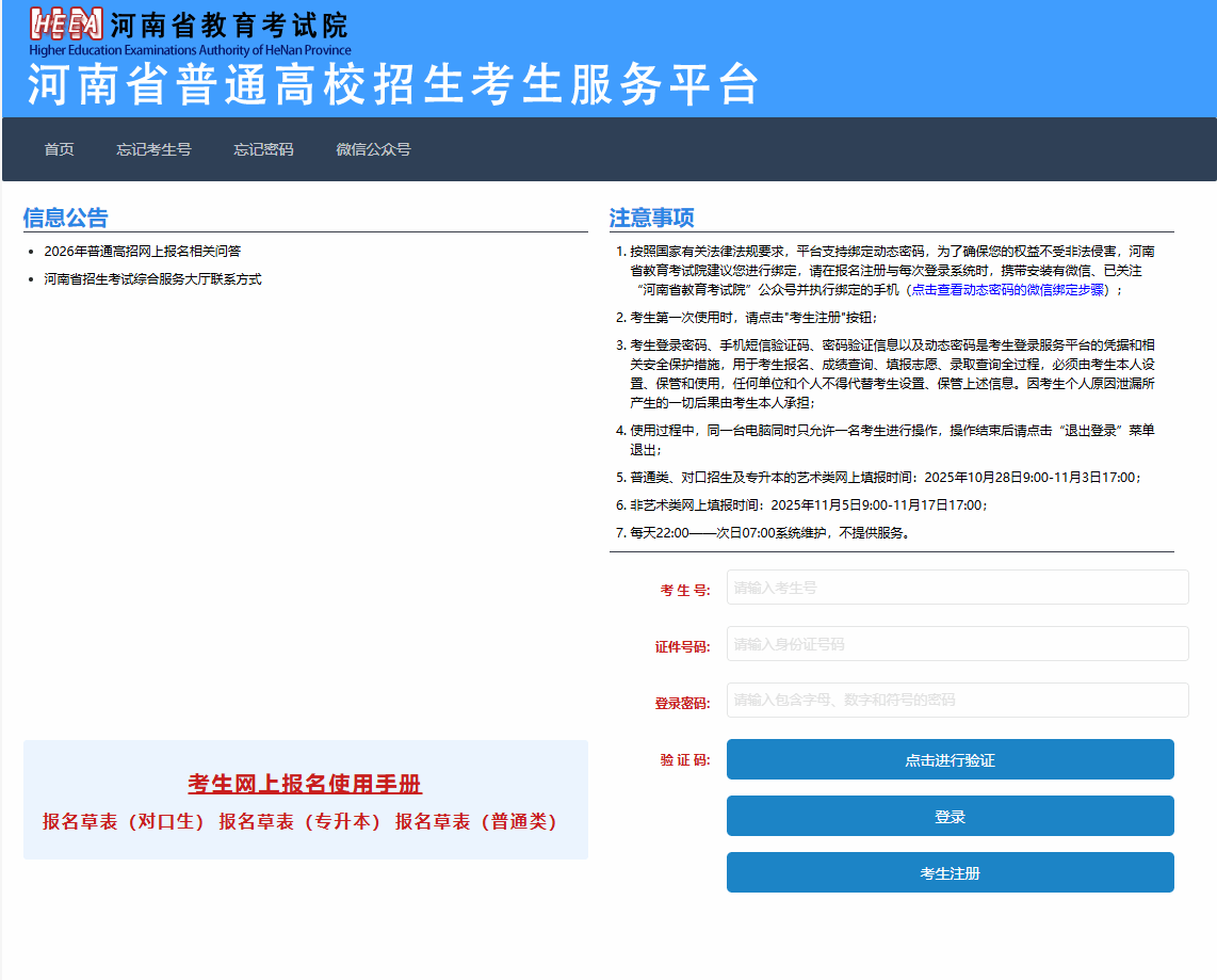 进入考生服务平台后,请仔细阅读“信息公告”区、“注意事项”区发布的政策公告和注意事项。